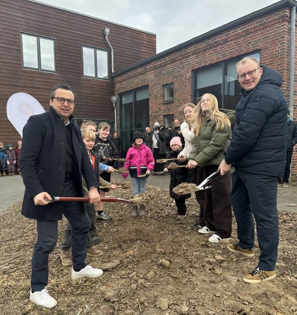 Første spadestik er taget til Voers Skabende HUB, hvor mere end 600 nye kvadratmeter skal samle skole, foreningsliv og lokalsamfund i fælles rammer for læring og fællesskab.
